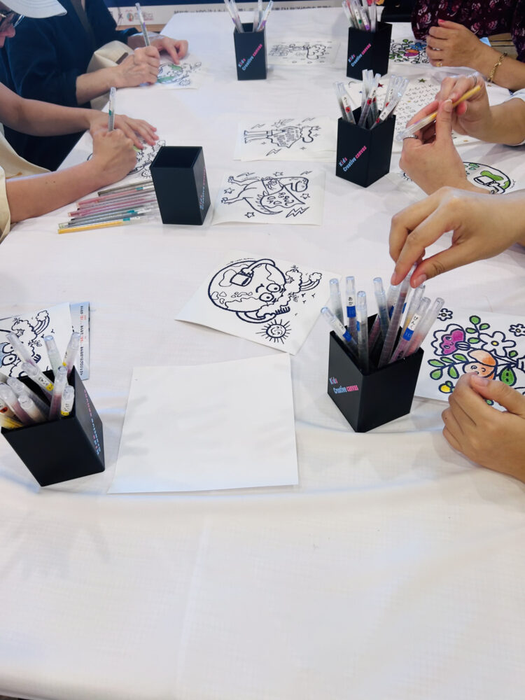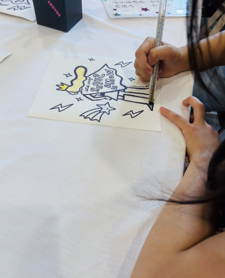 イラストに色を塗る手は年齢も国も関係なく夢中になり、その仕上がりに「きれい!」「洗っても落ちないってすごい!」という声が聞かれました。