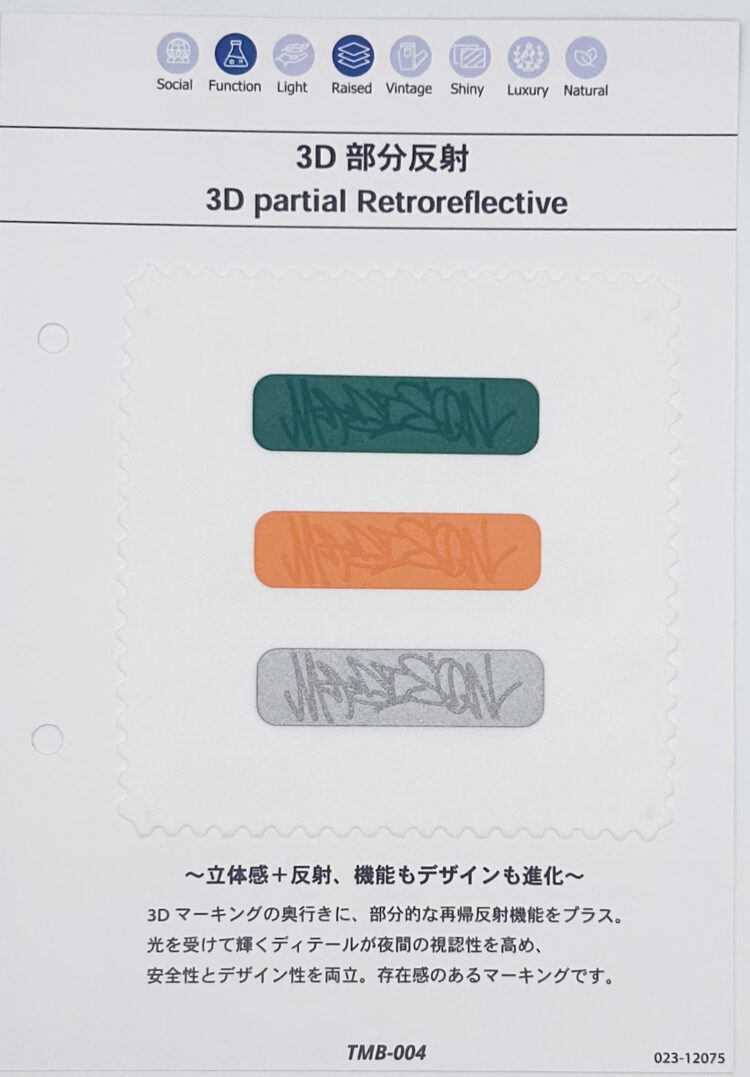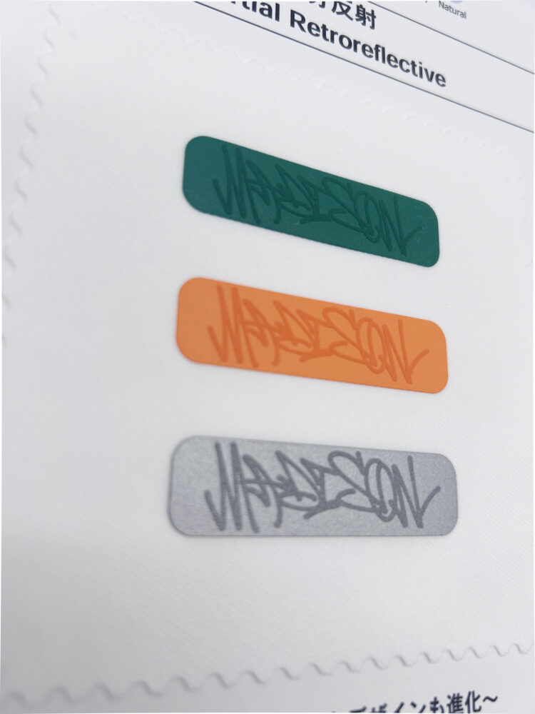 光が当たると再帰反射し、夜間の視認性とデザイン性を両立できます。
