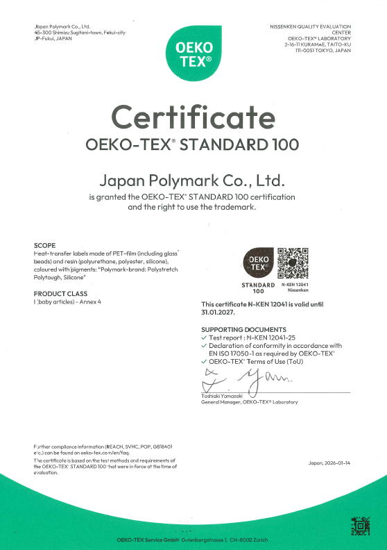 今年もエコテックススタンダード100 クラス1の認証を、2026年も継続したことをお知らせします。